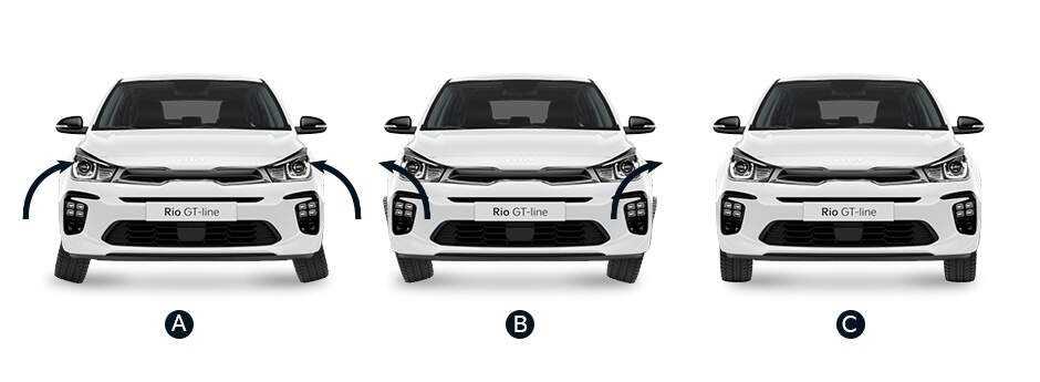 Felaktiga vinklar på hjulen, eller hjulinställningen, kan påverka slitaget på hjulens inre kanter (A) eller yttre (B). Hjul med korrekta vinklar (C) är parallell med varandra på varje hjulaxel. För att rikta in hjul krävs expertis och specialverktyg. Om du misstänker att din Kia behöver justera hjulinställningen, kontakta din Kia-verkstad.