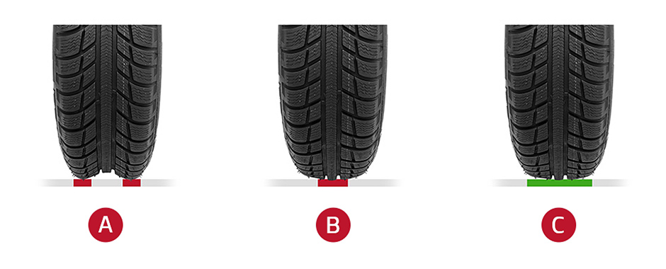 Att köra med för lågt tryck (A) ökar bränsleförbrukningen och påverkar också styr- och bromsförmågan. Det sliter även mer på däcken. Ett däck med för högt tryck (B) slits ojämnt och påverkar styrförmågan vid kurvor. Däck med rätt tryck (C) slits mindre, sänker bensinförbrukningen och gör din bil säkrare.